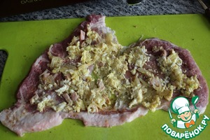 Смешать соль и перцы для мяса. Каждый кусочек посолить и поперчить с 2-х сторон. Тонким слоем намазать на каждый кусочек яичную начинку и свернуть рулетиком. Жирная сторона должна быть сверху рулетика. Связать рулетики шпагатом.