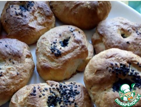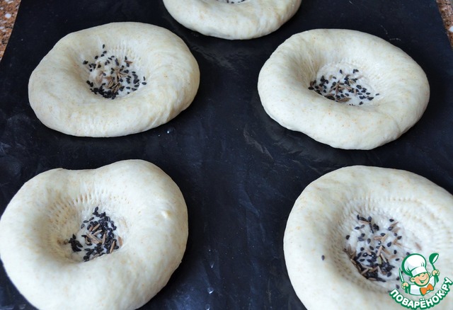 Расстоявшиеся заготовки в середине смазать водой и присыпать тмином и кунжутом. -