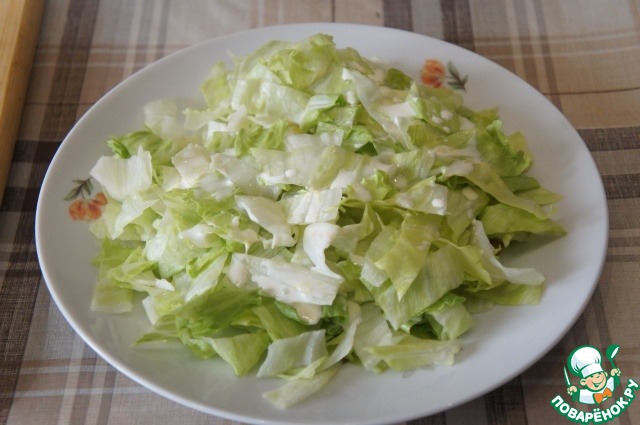 Пекинскую капусту - только верхнюю листовую часть - нарезать полосками и выложить на большое плоское блюдо.