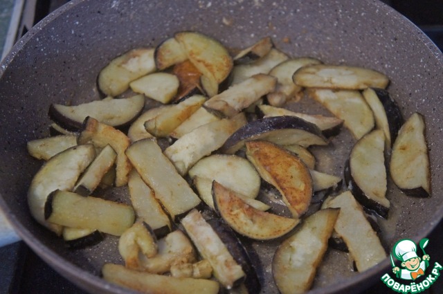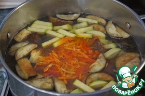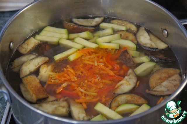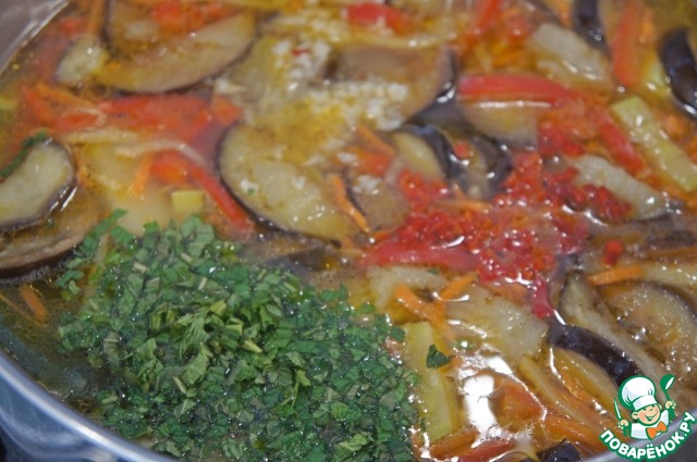 Затем баклажан, лавровый лист, посолить, всыпать крупу и варить на слабом огне до готовности.