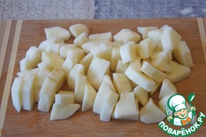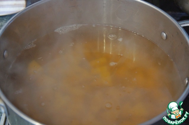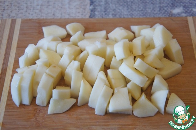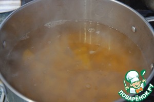 Бульон довести до кипения, всыпать картофель и варить до полуготовности.
