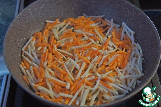 Морковь, сельдерей и перец очистить и нашинковать соломкой. Лук мелко нарезать. На растительном масле обжарить до прозрачности лук, добавить морковь и сельдерей, обжарить до полуготовности.