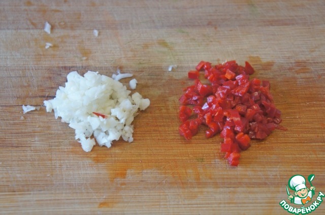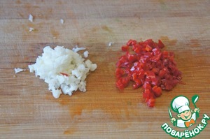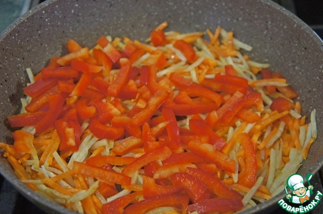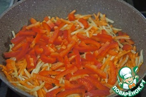 Всыпать болгарский перец и обжарить еще несколько минут. Отставить.