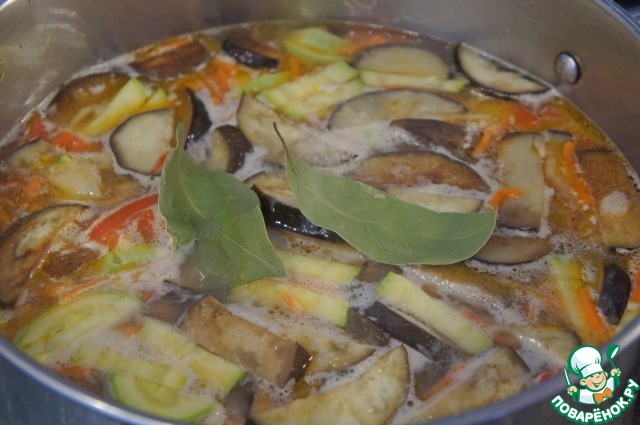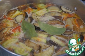 • Затем баклажан, лавровый лист, посолить, всыпать крупу и варить на слабом огне до готовности.