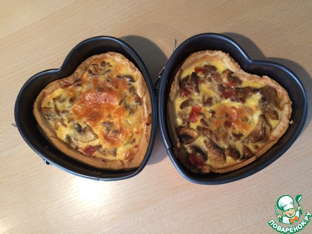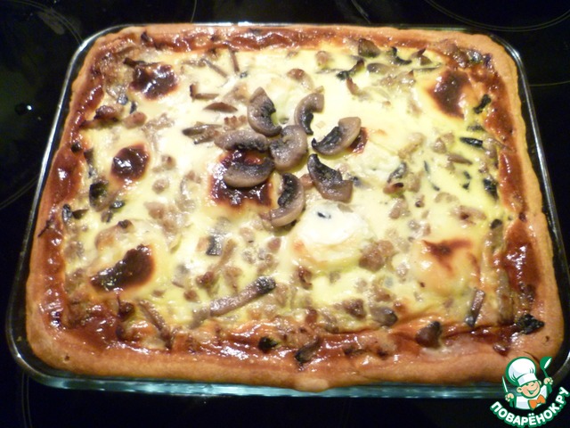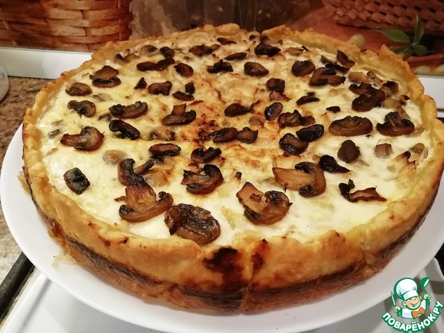 Затем пирог вынуть, разложить обжаренные ломтики грибов и допечь до готовности (еще минут 10).