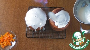Сделаю глазурь, для этого я беру пол чайной ложки желатина, заливаю соком апельсина. Далее, добавляем воду в сахарную пудру и хорошенько размешаем. Нагреваю все на медленном огне, постоянно помешивая и жду когда растворится сахар и смесь начнет закипать, потом отправляю сюда набухший желатин, размешаю. Сразу же, пока смесь горячая, взобью миксером. Взбивайте ее до такого состояния как вам нравится, я оставляю ее жидковатой, так как она застывает очень быстро, а я люблю подтеки.