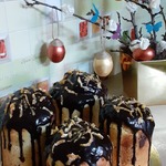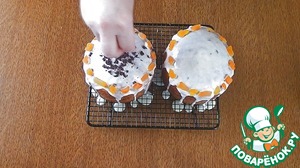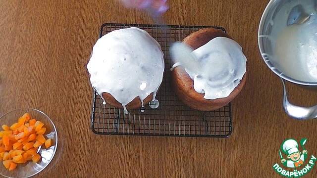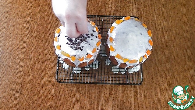 Покрываю глазурью куличи. По кругу выкладываю кусочки кураги, середину посыпаю кусочками шоколада.