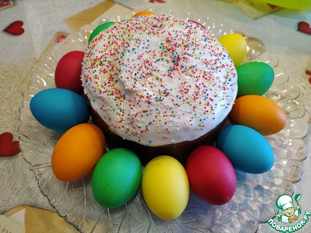 Поднялся не очень хорошо, несмотря на то, что два пакета разрыхлителя было. Но и тесто получилось гуще, чем на видео. За час пропекся. Из 4 штук на Пасху остался один
