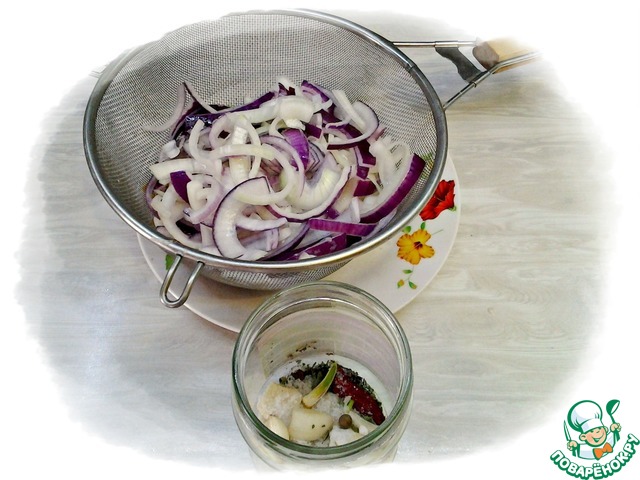 Лук нарезать полукольцами, поместить в сито или дуршлаг, медленно пролить кипятком (1,5-2 литра), остудить. Чеснок порезать вдоль на несколько долек.