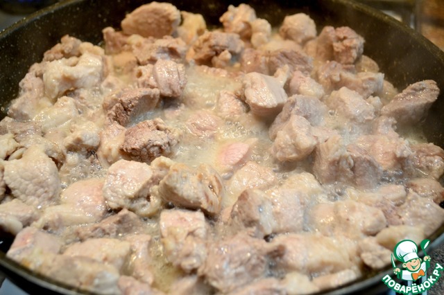 Мясо свинины нарезать на кусочки и обжарить.
