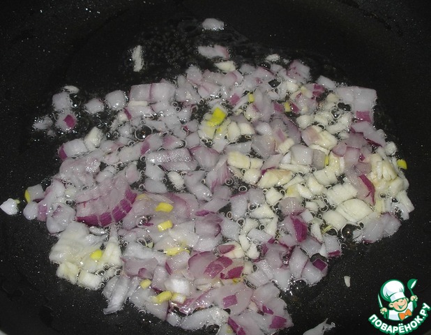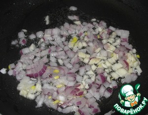 На разогретой сковороде обжариваю в 3 ст. л. растительного масла до румяности мелко нарезанные красный сладкий лук (половинка луковицы) и зубочек чеснока.
