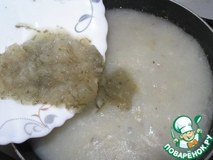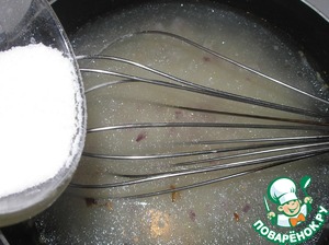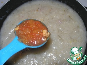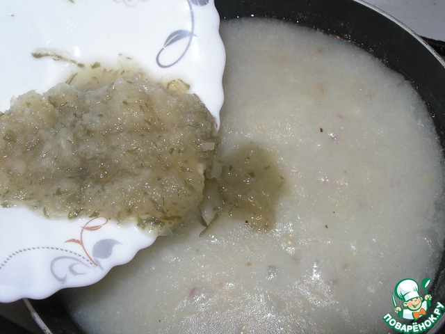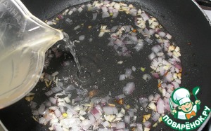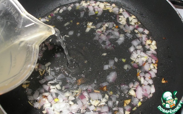 Как только лук и чеснок зарумянились, добавляю 250 мл картофельного отвара и довожу его до кипения.