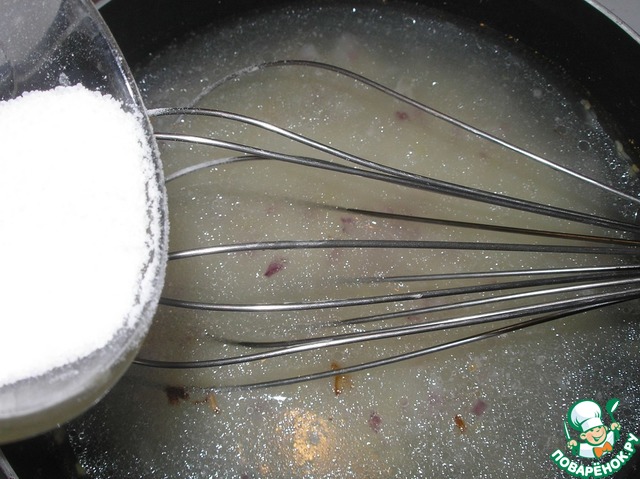 Огонь уменьшить до минимума, теперь постепенно добавляю 3 ст. л. рисовой муки, с помощью венчика постоянно помешиваю во избежания образования комочков.