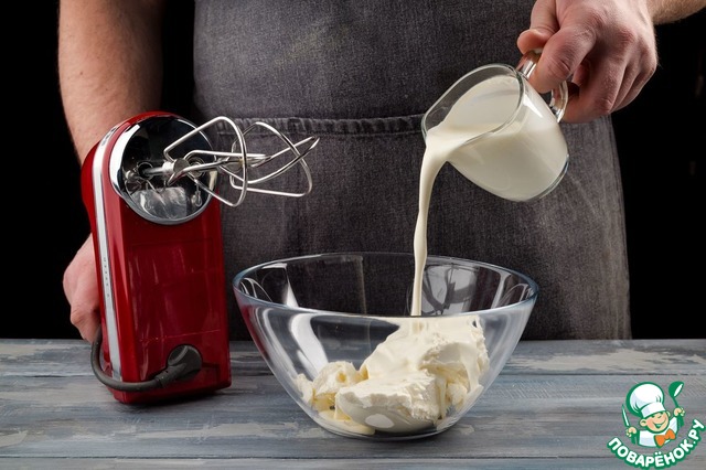 Творожный сыр Hochland взбейте со 100 мл сливок.