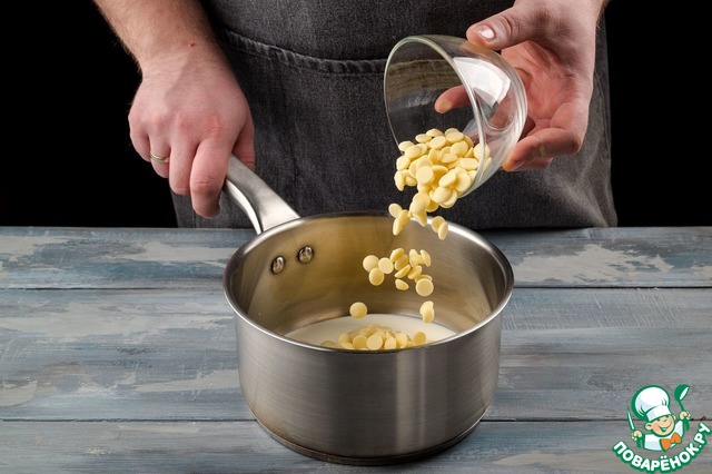Оставшиеся 50 мл сливок нагрейте в сотейнике и растопите в них белый шоколад.