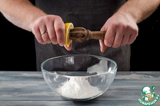Пока выпекается кулич, приготовьте лимонную глазурь. Для этого соедините постепенно 200 г сахарной пудры с лимонным соком, перетирая смесь ложкой.