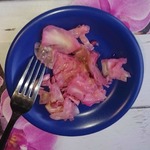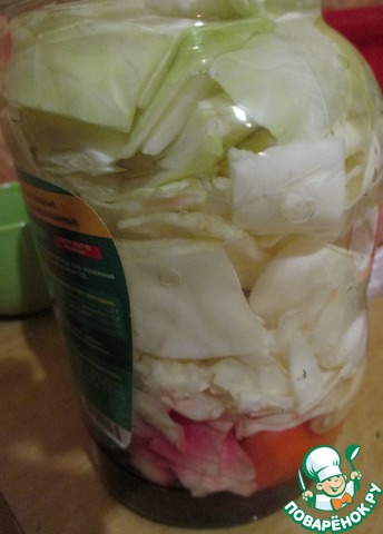 Через трое суток закрываем капусту крышкой и ставим в холодильник на 1 сутки. В итоге солим всего 4 суток. -