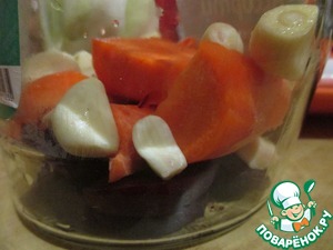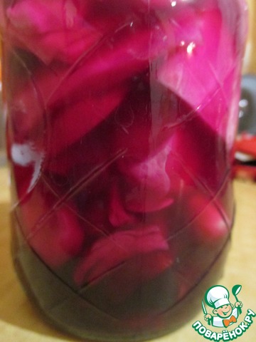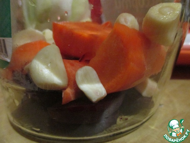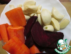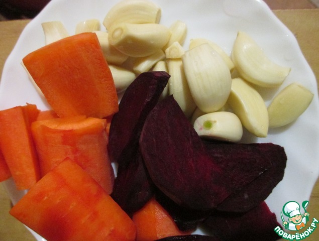 В банку, объёмом 1800 мл, на дно выкладываем свёклу, сверху морковь, а потом чеснок (чеснока сколько хотите по вкусу, у меня полторы головки чеснока))
