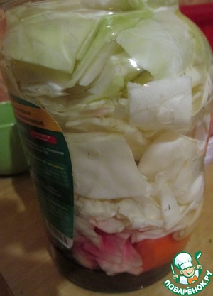 Вода закипела, соль растворилась - сразу заливаем капусту.
