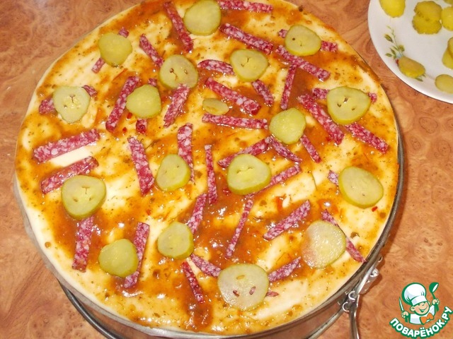 Переносим раскатанное тесто на подготовленную форму и поправляем края. По необходимости растягиваем немного. Пласт теста смазываем капелькой растительного масла, чтобы тесто не размокало от начинки. Затем смазываем соусом. Не забываем, что количество ингредиентов рассчитано на две пиццы.