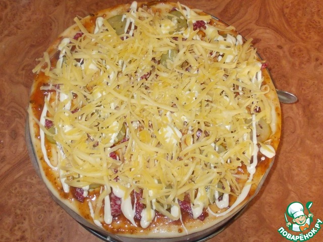 Этот рецепт удобен тем, что тесто не требует времени для подъема... Замесили и сразу же готовим пиццу! Повторюсь, что начинку можно абсолютно любую! Количество ингредиентов тоже по вкусу! Единственно. что я бы советовала - если делаете пиццу с колбасой, то не кладите сильно много колбасы! Иначе будет жирновато... А в остальном Ваша фантазия. Приятного аппетита!