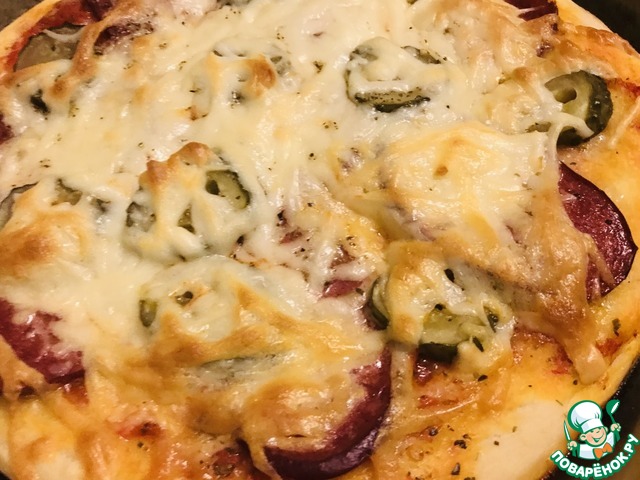 Многие любят пиццу! Некоторые любят пышненькую, некоторые тонкую и разнообразие начинок огромнейшее! Мой рецепт посвящается не какой-то конкретной начинке, а способу приготовления теста. Очень быстрый способ! Из серии - гости на пороге! Пицца получается тонкая, но мягкая! Структура теста мелко-пористая... Заходите, смотрите, угощайтесь! Прежде, чем добавить рецепт своей пиццы, я перечитала массу уже размещенных и похожего не нашла... Ингредиенты рассчитаны на две пиццы диаметром 26 см.