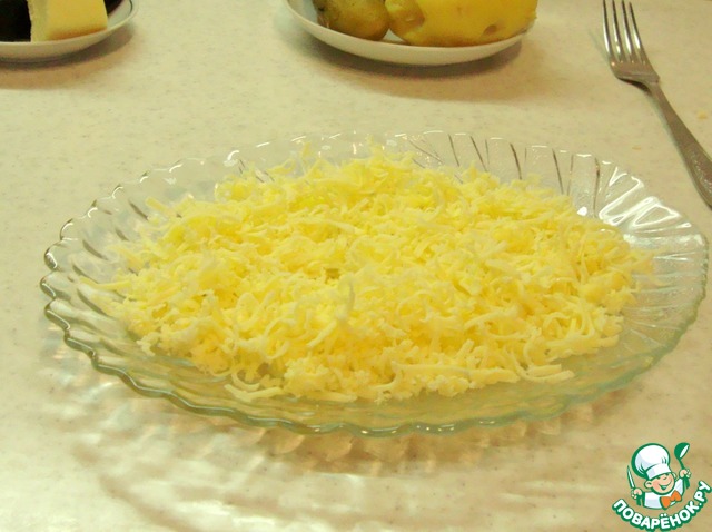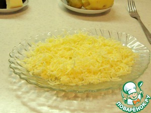Сыр натереть на мелкой терке и выложить первым слоем на тарелку.