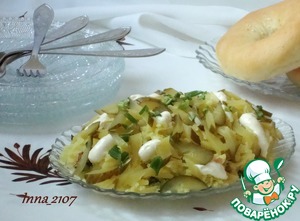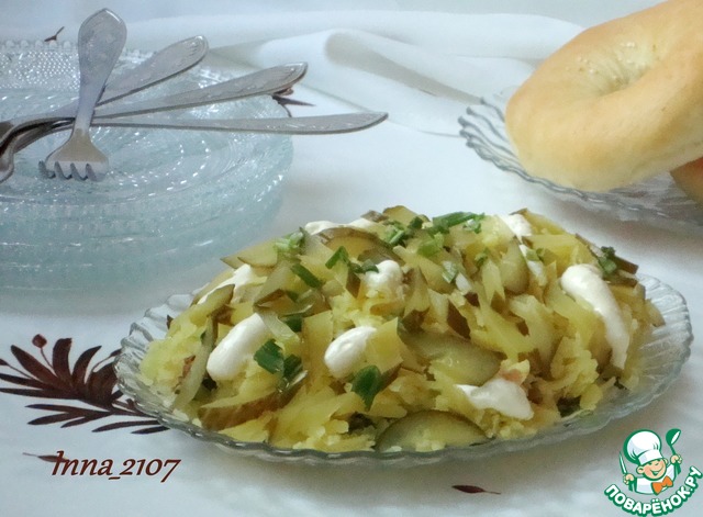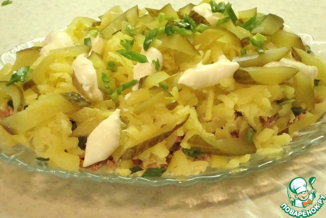 Соленый огурец нарезать соломкой и выложить на картофель, затем нанести на слой картофеля с огурцами немного майонеза и дать салату настояться в холодильнике примерно 1 час -