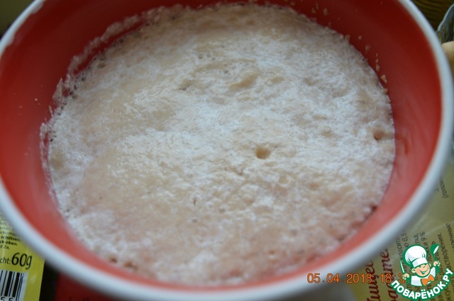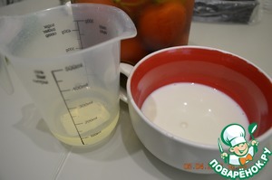 Смешиваем молоко, рассол, дрожжи Если рассол у вас сладкий (то есть например от помидоров), то сахар добавлять не нужно, а если нет, то добавьте сахар по рецепту. Убираем в тепло на 15 минут.