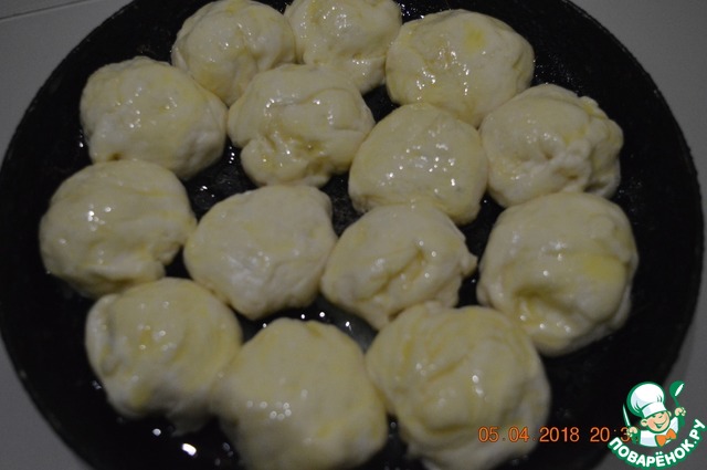 Тесто должно увеличиться в 2-3 раза. Смазываем форму для выпечки и руки растительным маслом. Делим тесто на 10-14 равных частей. Руками формируем из каждой части теста колобок и выкладываем в форму на небольшом расстоянии друг от друга. Оставляем в тепле на 15 минут и смазываем булочки желтком.