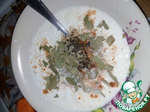 Делаем заправку. Майонез ( у меня был домашний ), смешиваем с молоком, добавляем соль, перец, кориандр, кайен и поломанный лавровый лист, хорошо перемешиваем.