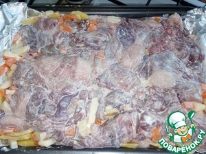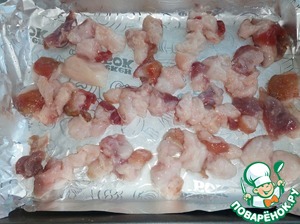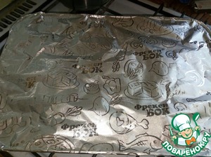 Берем глубокую форму, застилаем фольгой. Дно я немного смазала растительным маслом. И так как у меня в нутрии были жирненькие места, весь жирок я положила на дно формы. Можно этого и не делать.