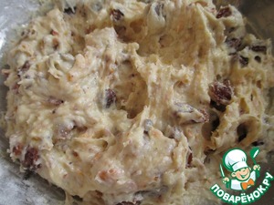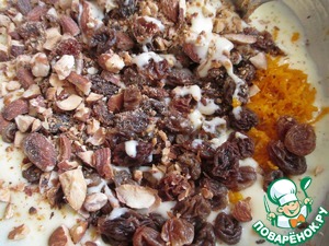 Всыпать промытый обсушенный изюм и дроблёный миндаль. -