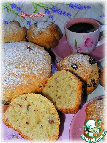 Выпекала 6 маленьких кексов и один побольше! Из отступлений - миндаль заменила грецким орехом и глазурь не делала, просто присыпала слегка сахарной пудрой! Как любителю творожной выпечки, было невероятно сложно делать фотоотчёт, хотелось всё бросить и вкушать эту божественную выпечку!!! Умопомрачительный аромат, сногсшибательное тесто, а начинка с изюмом и орехами - это контрольный выстрел! Влюбилась по уши в этот рецепт, обязательно буду и дальше готовить!!!