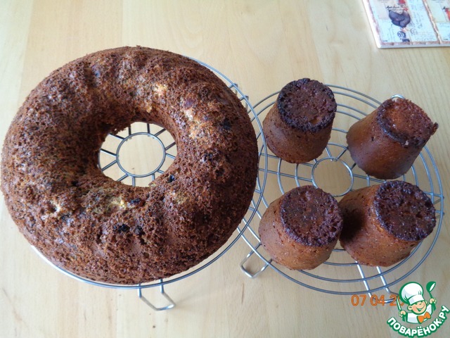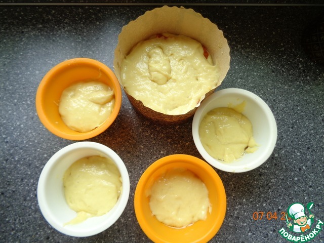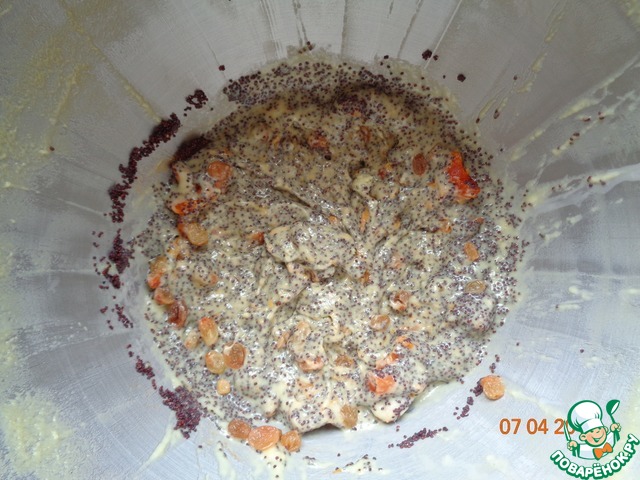 Тесто жидковатое и лёгкое. Одну часть теста смешиваем с изюмом, другую с курагой следующую порцию сделаем с маком и т. д. - на Ваш вкус или кладем в формочки чередуя тесто - сухофрукты (и прочее) - тесто.