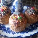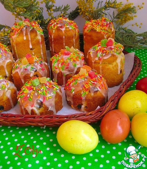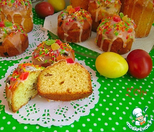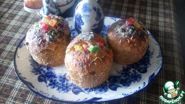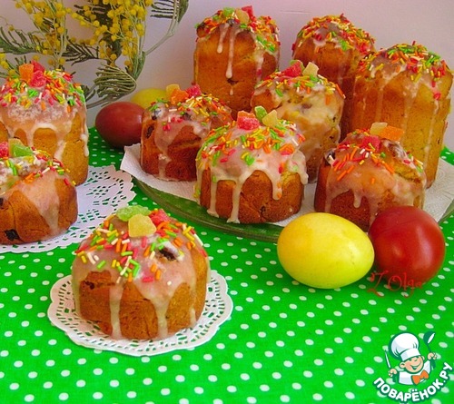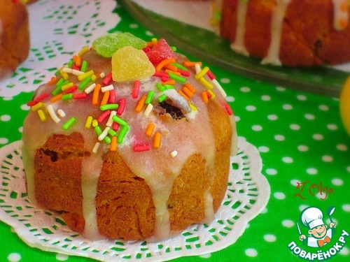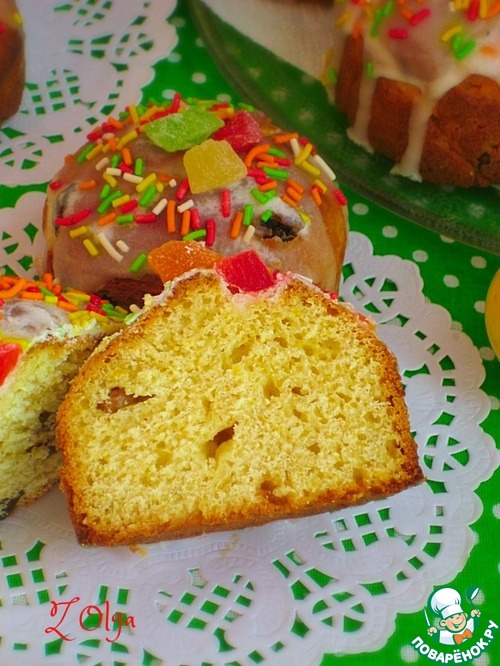 Покрыть верх еще теплых куличей глазурью, украсить цветной посыпкой и цукатами.