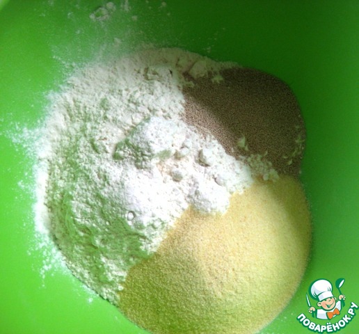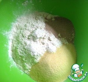 В миске смешать половину пшеничной муки, семолину, щепотку соли и сухие быстродействующие дрожжи.