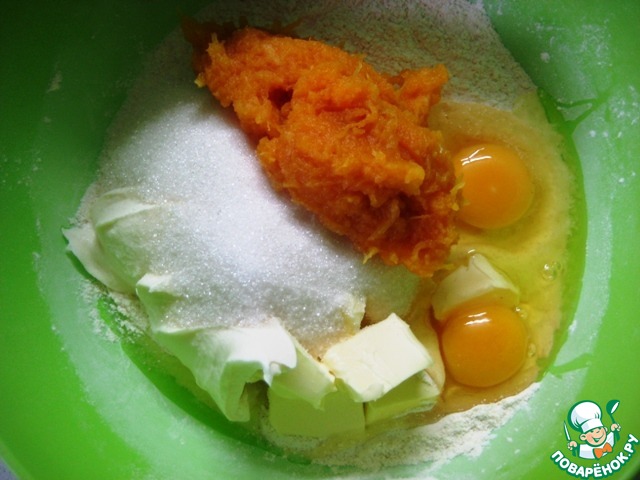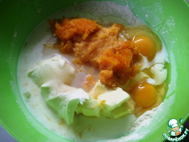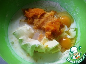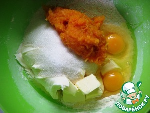Добавить яйца, сметану, сахар, тыквенное пюре, мягкое сливочное масло (все ингредиенты комнатной температуры).