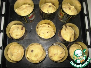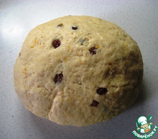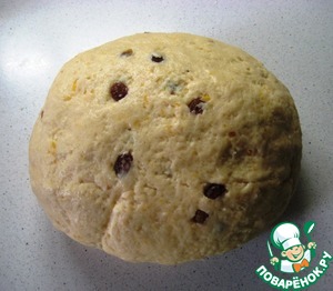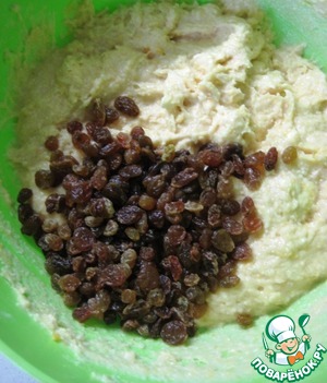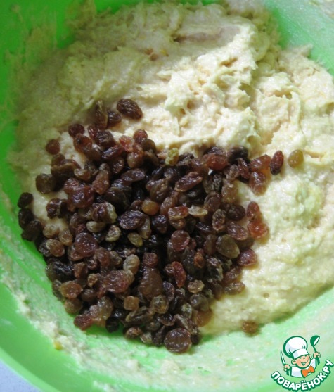 Добавить изюм (предварительно залить его кипятком, дать постоять минут 10-15, затем воду слить, изюм просушить), еще перемешать тесто.