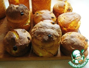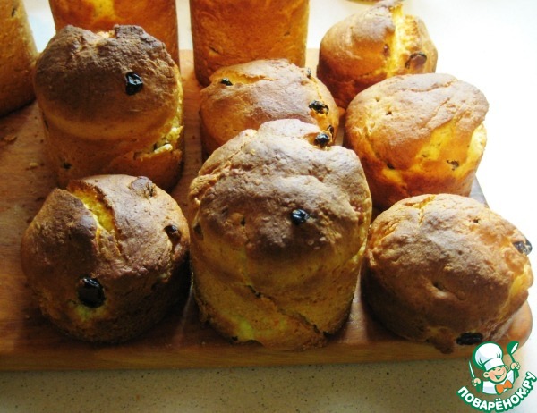 Поставить формы с куличами в разогретую до 190 градусов духовку на 20-25 минут (готовность проверяем деревянной шпажкой). Готовые куличи вынимаем из духовки, даем им чуть остыть.