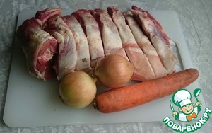 В кастрюлю с кипящей водой закладываем баранину, лук, морковь, пару-тройку листиков лаврушки, перец горошком, немного соли.