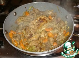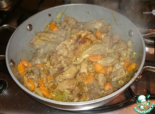 Добавляем бульон, который получился при варке баранины (примерно 200-250 мл. Зависит от количества мяса.)