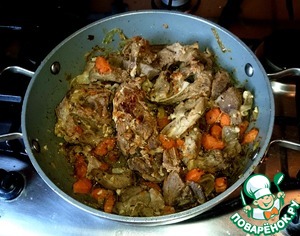 Все перемешиваем. Ждем когда мясо немного обжарится. -