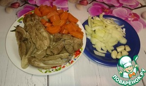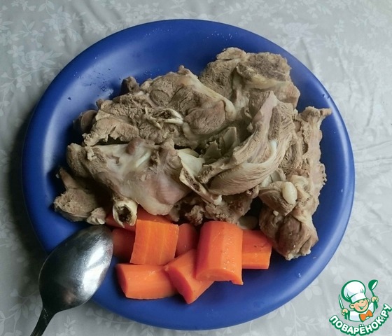 Достаем мясо и морковь из кастрюли. Даем им немного остыть.