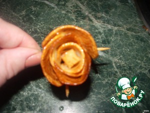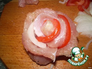 Делаем розочку из филе. Вырезаем небольшой брусочек из филе - это будет серединка. На пластину филе кладем пластину помидора и оборачиваем вокруг серединки, закрепляем зубочисткой. Берем еще пласт филе, на него кладем пластинку лука, оборачиваем вокруг нашего бутончика. И так пока не наберется необходимое количество лепестков. У меня получалось в каждой розочке 3 лепестка. Каждый лепесток закрепляем зубочисткой.