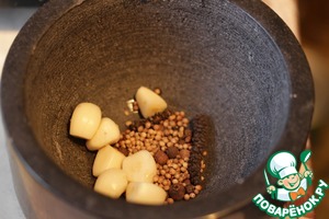 Чеснок растереть с зернами кориандра и горошинами перца.