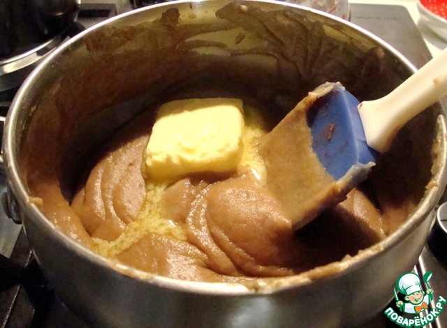 Когда на поверхности крема начнут появляться пузыри, то нужно сразу выключить огонь и добавить масло сливочное.