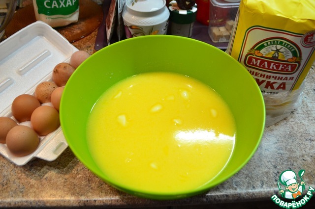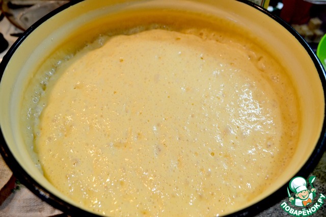Молоко разогреть, добавить сливочное масло, 1 стакан сахара, соль, яйца, дрожжи... -