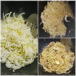 Значит, лук отправляем в казан, прямо сразу хорошо перемешиваем, чтобы лук промаслился. Лук надо довести до состояния предпрозначности. Чтобы он уже мягкий стал, но и зажаривать не стоит. Процесс этот сопровождается постоянным перемешиванием. Видите у меня в луке виды поджаритости? Зевнул разок, вот и…. В общем, шумовку лучше из рук не выпускать.