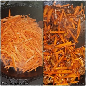 Жарить морковку со всеми присными надо до состояния «чтобы моркошка свесила ножки», что называется. В общем, морковка станет мягкой и наберется духа такого … мясо – лукового. И мясо, видите, тоже от морковки вкуса наберется.